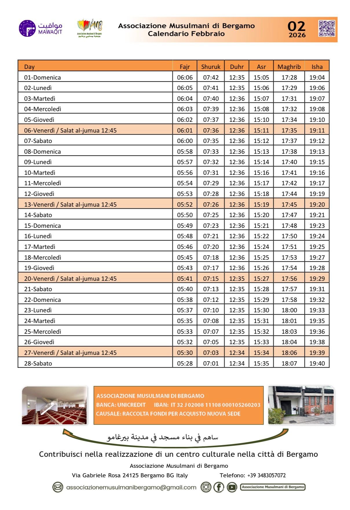 Orario preghiera mese di febbraio a Bergamo